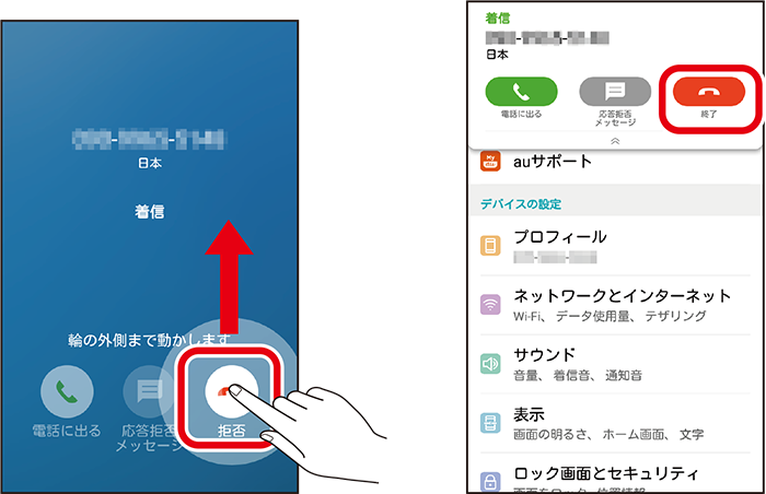 着信を拒否するには、を輪の外側までスワイプします。