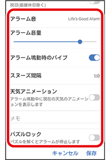 アラームの設定画面を上にスライドすると、アラーム音やスヌーズなどを設定できます。