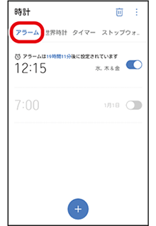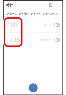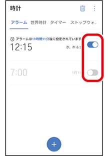 アラームの設定や解除をする場合は、時間の右側の/をタップ