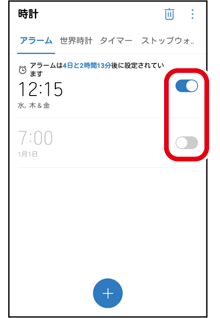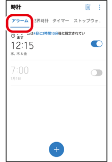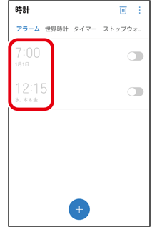アラームの設定や解除をする場合は、時間の右側の/をタップ