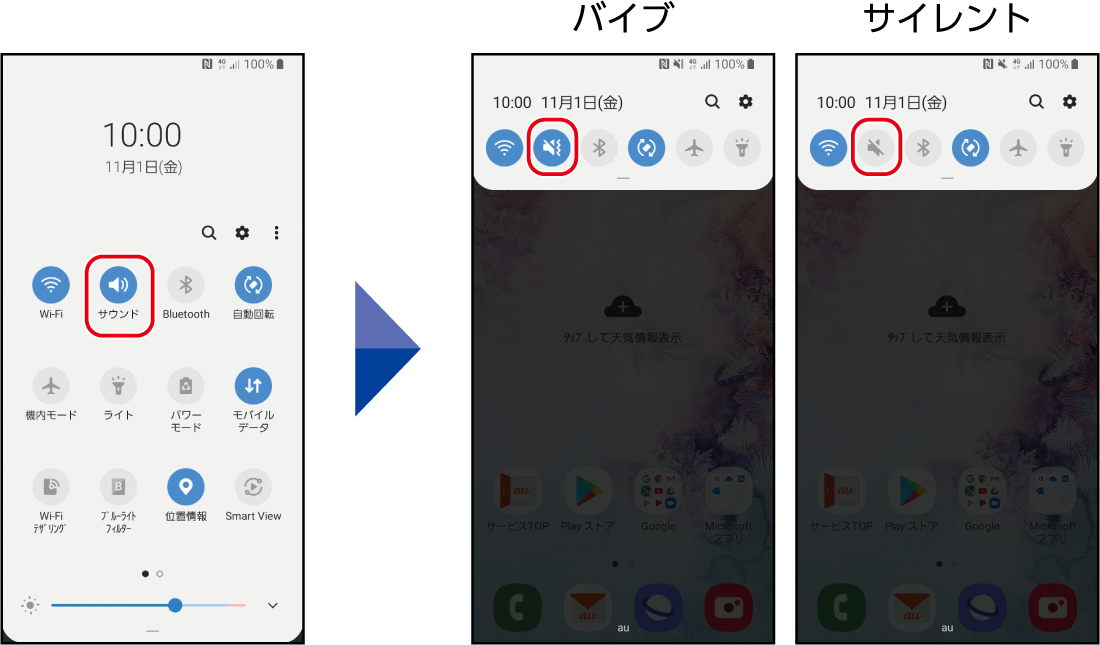 通知パネルのサウンドアイコンをタップしても、マナーモードに設定できます。
