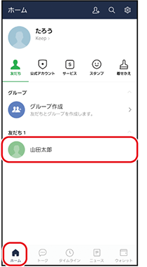 「ホーム」をタップして、LINEのホーム画面を表示し、LINE電話をかけたい友だちをタップ