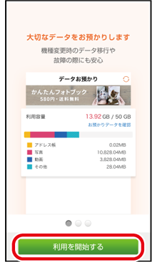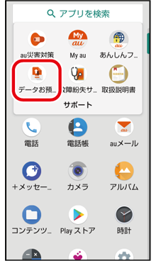 ホーム画面で「アプリ一覧」をタップして、「サポート」をタップし、「データお預かり」をタップ