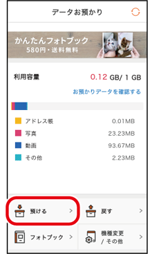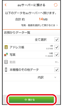 預けるデータをタップしてチェックを入れ、「預ける」をタップ