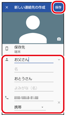 名前、電話番号など必要な項目を入力し、「保存」をタップ