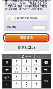 利用規約を読み、暗証番号を入力し、「同意する」をタップ