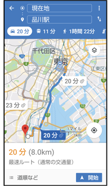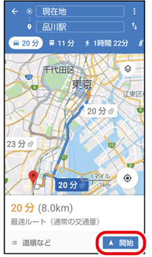 「開始」をタップすると、目的地までのルート案内が開始されます