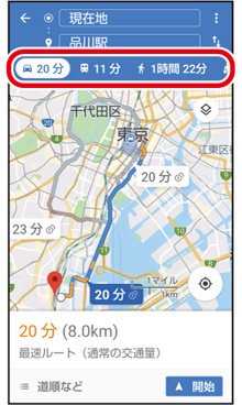 をタップすると、自動車、電車/バス、徒歩での経路が表示されます