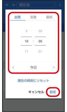 の画面)は、「出発時刻」をタップして、出発/到着時刻を入力し、「設定」をタップすると、入力した時刻でのルートを表示できます。