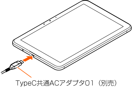 TypeC共通ACアダプタ01 (別売) を接続して充電する方法を説明します。 指定のACアダプタ (別売) については、 「周辺機器」 をご参照ください。