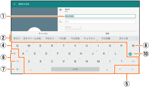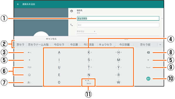 一般的な携帯電話と同じ順序で文字が並んでいるキーボードです。 キーボードをタップするたびに文字が切り替わります。 また、 「フリック入力」 を行うこともできます。 詳しくは 「フリック入力について」 をご参照ください。