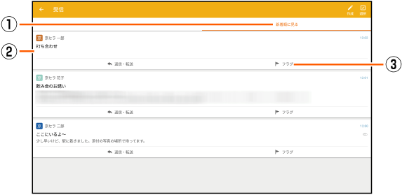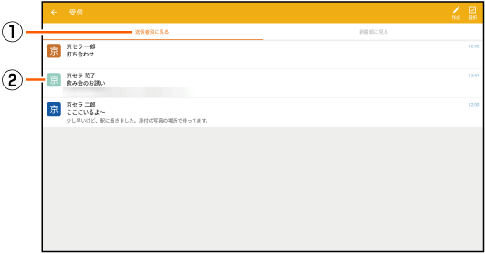 送信者別表示画面の場合は、 送信者をタップしてから閲覧するメールをタップします。