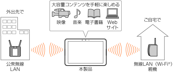 家庭内で構築した無線LAN (Wi-Fi®) 環境や、 外出先の公衆無線LAN環境を利用して、 インターネットサービスに接続できます。