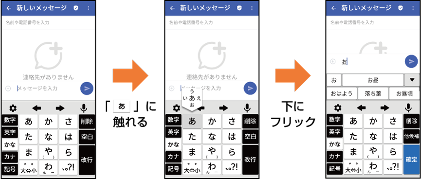 キーに触れると、フリック入力で入力できる候補が表示されます。そのまま入力したい文字が表示されている方向にフリックすると、文字入力エリアに文字が入力されます。例えば「あ」を入力する場合は「