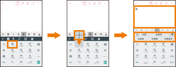 「10キー」の場合、キーを上下左右にフリックすることで、キーを繰り返してタップすることなく、入力したい文字を表示することができます。 キーをロングタッチすると、フリック入力で入力できる候補が表示されます。入力したい文字が表示されている方向にフリックすると、文字入力エリアに文字が入力されます。 |