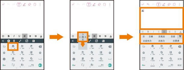 「10キー」の場合、キーを上下左右にフリックすることで、キーを繰り返してタップすることなく、入力したい文字を表示することができます。 キーをロングタッチすると、フリック入力で入力できる候補が表示されます。入力したい文字が表示されている方向にフリックすると、文字入力エリアに文字が入力されます。 |