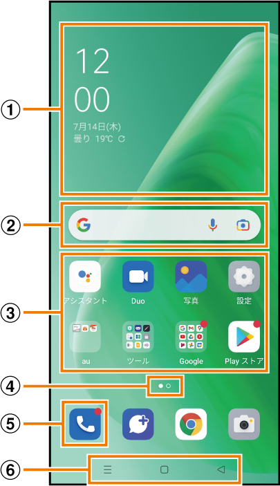 ホーム画面は複数の画面で構成されており、左右にフリック(▶こちら)すると切り替えることができます。