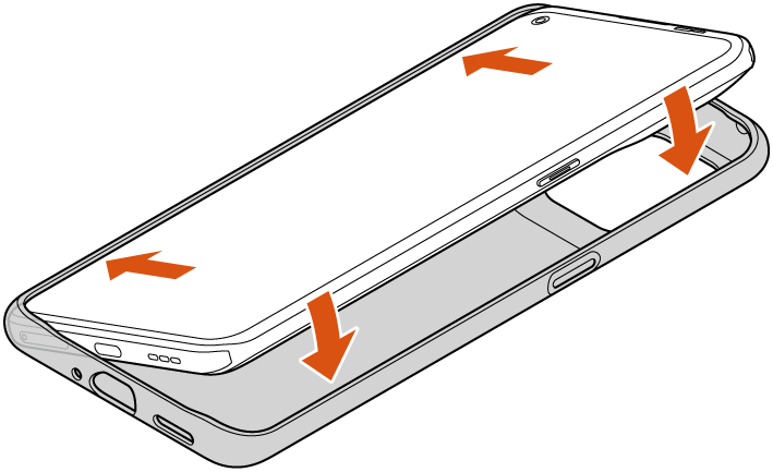 本製品と保護ケース(試供品)の角を合わせ、矢印の向きで本製品を保護ケース(試供品)にはめ込む