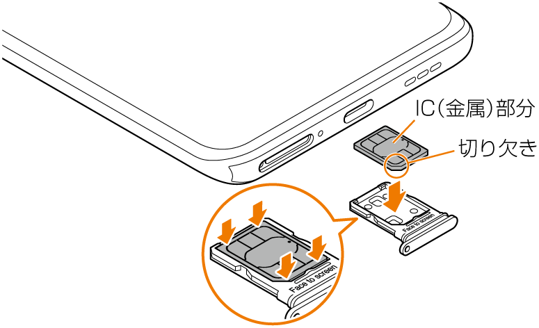 au ICカードのIC(金属)部分を上にしてau ICカードトレイにはめこむ
