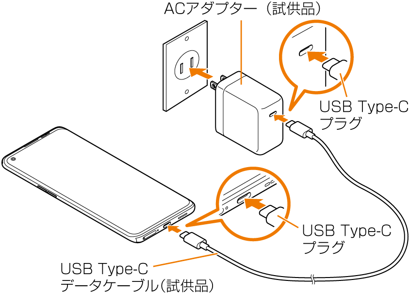 充電には指定のACアダプタが必要です。ここでは、付属のACアダプター(試供品)およびUSB Type-Cデータケーブル(試供品)を使って充電する方法を説明します。