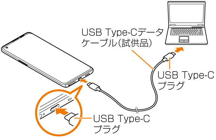USB Type-Cデータケーブル(試供品)のもう一方のUSBプラグを、パソコンのUSBポートに差し込む