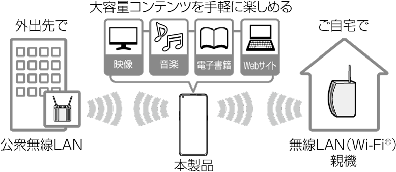 ご自宅などでご利用になる場合は、インターネット回線と無線LAN親機(Wi-Fi®ネットワーク)をご用意ください。 外出先でご利用になる場合は、あらかじめ外出先のWi-Fi®ネットワーク状況を、公衆無線LANサービス提供者のホームページなどでご確認ください。公衆無線LANサービスをご利用になるときは、別途サービス提供者との契約などが必要な場合があります。 すべての公衆無線LANサービスとの接続を保証するものではありません。 無線LAN(Wi-Fi®)機能は、電波を利用して情報のやりとりを行うため、電波の届く範囲であれば自由にLAN接続できる利点があります。その反面、セキュリティの設定を行っていないときは、悪意ある第三者により不正に進入されるなどの行為をされてしまう可能性があります。お客さまの判断と責任において、セキュリティの設定を行い、使用することを推奨します。 |