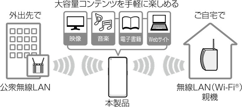 ご自宅などでご利用になる場合は、インターネット回線と無線LAN親機(Wi-Fi®ネットワーク)をご用意ください。 外出先でご利用になる場合は、あらかじめ外出先のWi-Fi®ネットワーク状況を、公衆無線LANサービス提供者のホームページなどでご確認ください。公衆無線LANサービスをご利用になるときは、別途サービス提供者との契約などが必要な場合があります。 すべての公衆無線LANサービスとの接続を保証するものではありません。 無線LAN(Wi-Fi®)機能は、電波を利用して情報のやりとりを行うため、電波の届く範囲であれば自由にLAN接続できる利点があります。その反面、セキュリティの設定を行っていないときは、悪意ある第三者により不正に進入されるなどの行為をされてしまう可能性があります。お客さまの判断と責任において、セキュリティの設定を行い、使用することを推奨します。 |