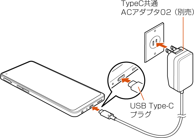 充電には指定のACアダプタ(別売)が必要です。ここでは、TypeC共通ACアダプタ02(別売)を使って充電する方法を説明します。