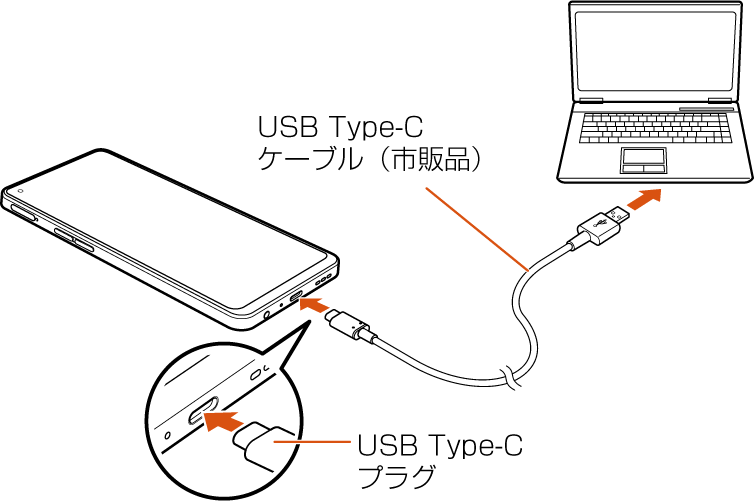 USB Type-Cケーブル(市販品)のUSBプラグをパソコンのUSBポートに差し込む