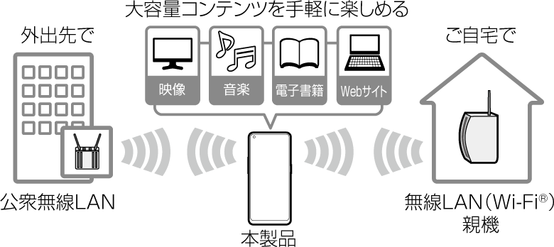 家庭内で構築した無線LAN(Wi-Fi®)環境や、外出先の公衆無線LAN環境を利用して、インターネットサービスに接続できます。