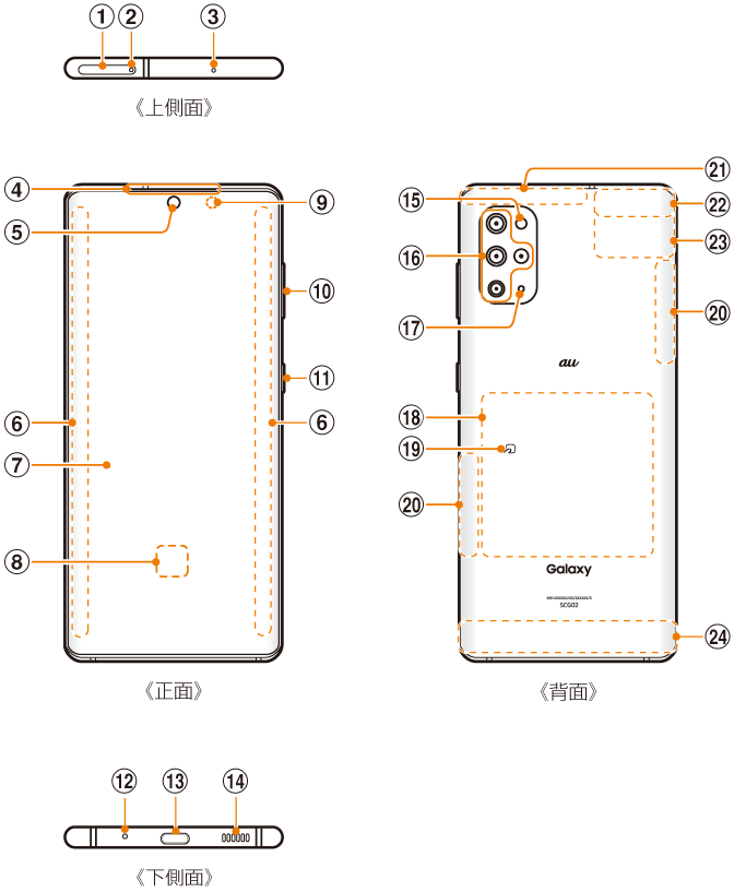 本製品の背面カバーは取り外せません。無理に取り外そうとすると破損や故障の原因となります。また、電池は本体に内蔵されており、お客様による取り外しはできません。 強制的に再起動する場合は、「電源を入れる/切る」をご参照ください。 カメラのレンズを直射日光などの強い光にあてないようにしてください。強い光にあてると、カメラのイメージセンサーの故障の原因となります。イメージセンサーの故障は回復できず、撮影した写真にドットなどが発生する場合があります。 エッジスクリーン(曲面部分)の色は見る角度によって変わる場合があります。 |