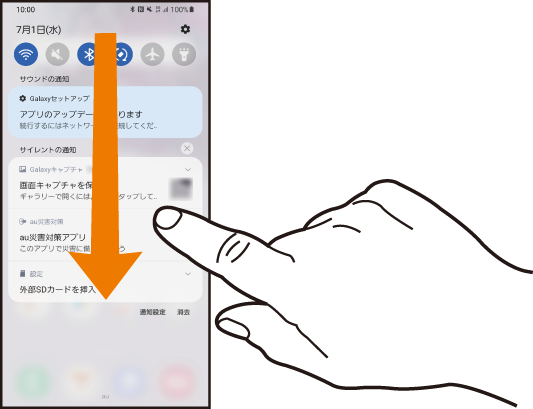 ステータスバーに通知アイコンが表示されているときは、ステータスバーを下にスライドして通知パネルを開くと、通知の概要を確認できます。