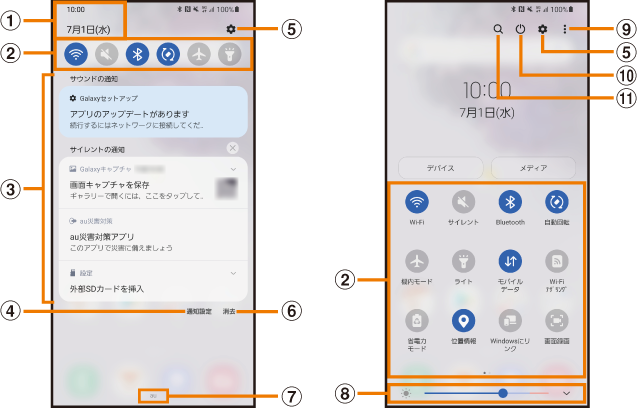 また、通知パネルのアイコン(クイック設定ボタン)をタップして機能を設定したり、通知情報などを確認したりすることができます。通知パネルの画面(左下図)を下にフリックすると、表示されていないクイック設定ボタンを確認できます(右下図)。また、通知パネルの画面(左下図)を上にフリックすると、通知パネルを閉じます。