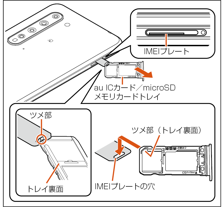 IMEIプレートについて au ICカード/microSDメモリカードトレイの挿入口付近には、IMEI情報(端末識別番号)を印刷したシールが貼られたプレートが収納されています。修理依頼やアフターサービスなどで、IMEI番号が必要となる場合を除き、プレートを引き出さないでください。また、シールをはがしたりしないでください。 |