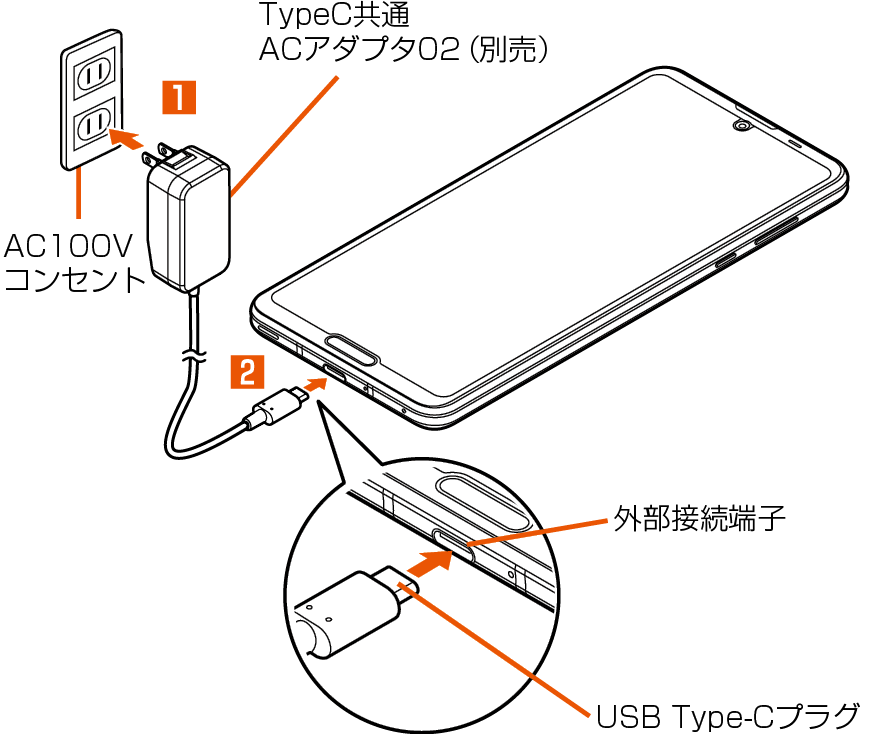 TypeC共通ACアダプタ02(別売)を接続して充電する方法を説明します。指定のACアダプタ(別売)について詳しくは、「周辺機器」をご参照ください。