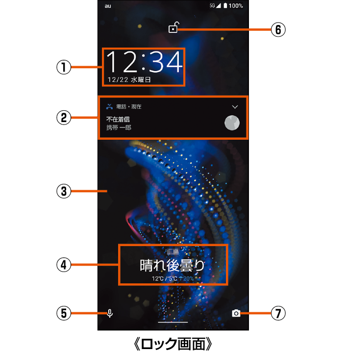 「画面ロック」で解除方法を設定している場合は、設定した方法で画面ロックを解除してください。解除方法を「なし」に設定している場合は、ロック画面は表示されません。 |