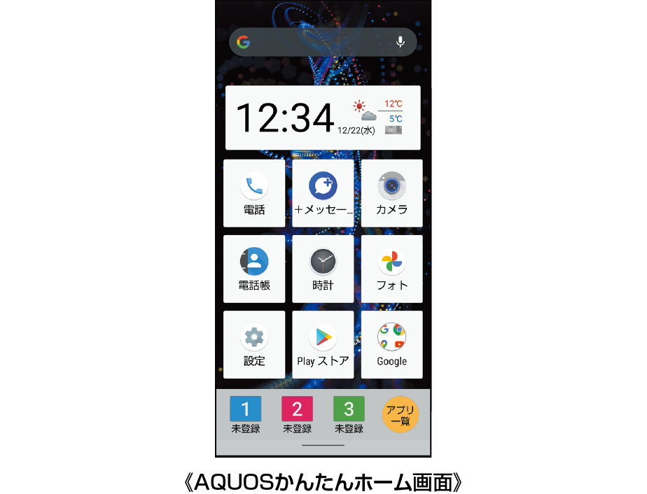 AQUOSかんたんホームは、ホーム画面(デスクトップシート)とアプリ一覧画面で構成されたホームアプリです。