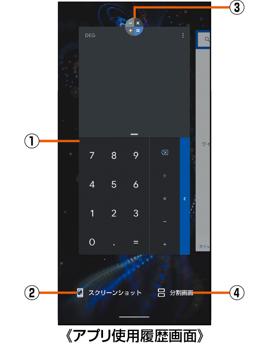 アプリ使用履歴画面中央に、分割画面上部で利用するアプリを表示→[分割画面]