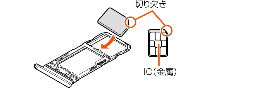 au ICカードのIC(金属)面を下向きにして、au ICカード/microSDメモリカードトレイに取り付ける