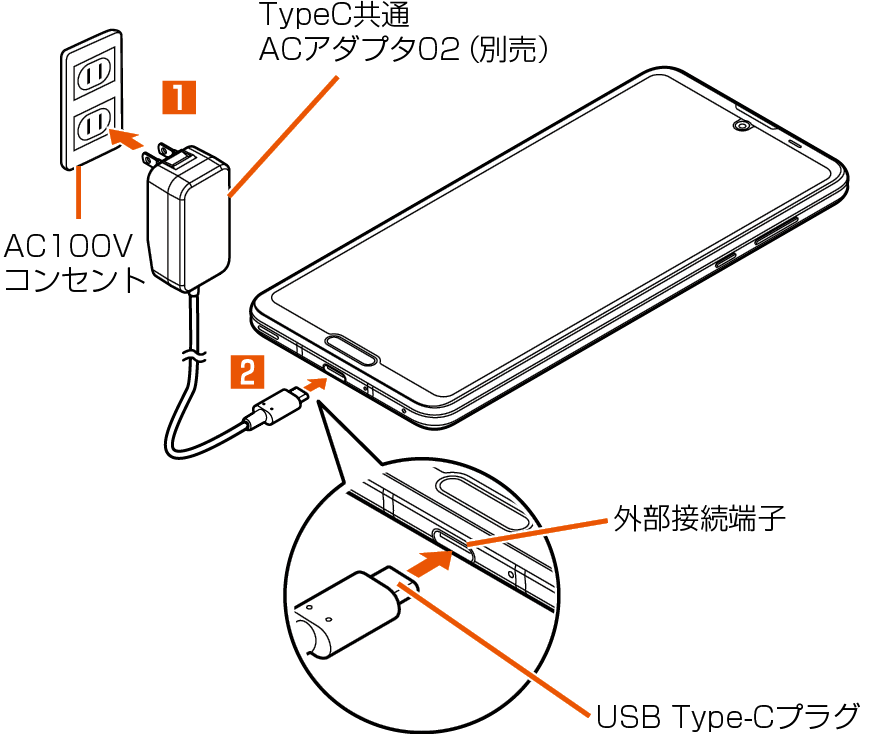 TypeC共通ACアダプタ02(別売)を接続して充電する方法を説明します。指定のACアダプタ(別売)について詳しくは、「周辺機器」をご参照ください。