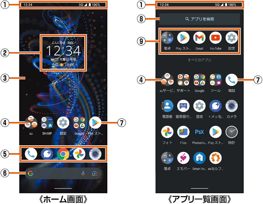 AQUOS Homeは、ホーム画面(デスクトップシート/お気に入りトレイ)とアプリ一覧画面で構成されたホームアプリです。