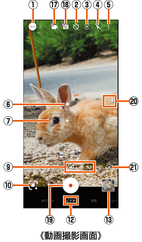 「8Kワイド」は、比較的明るい屋外での撮影に適しています。室内や暗いシーンでズームを使った撮影を行うと、画像が粗くなることがあります。その場合は、撮影モード「ビデオ」で撮影することをおすすめします。 |