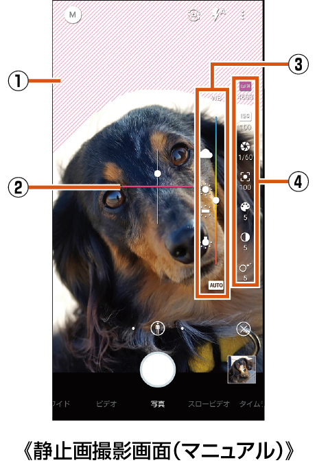 撮影モードや撮影メニュー、設定などによっては、画面上部や右端に広角カメラの歪み補正やISO感度など設定アイコンが表示されます。アイコンをタップすると設定を変更できます。 画面の右端に表示される設定アイコンは「 |