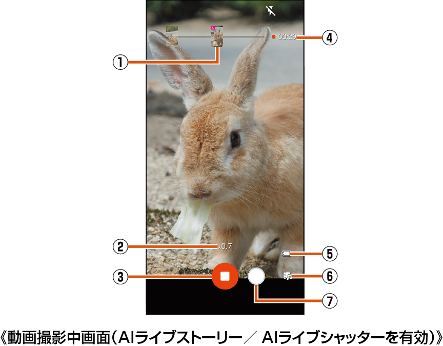 撮影メニューを「オート」に設定している場合、ズーム倍率が1.0以上のときは、動画撮影中に静止画を撮影できません。また、「AIライブシャッター」も動作しません。 |