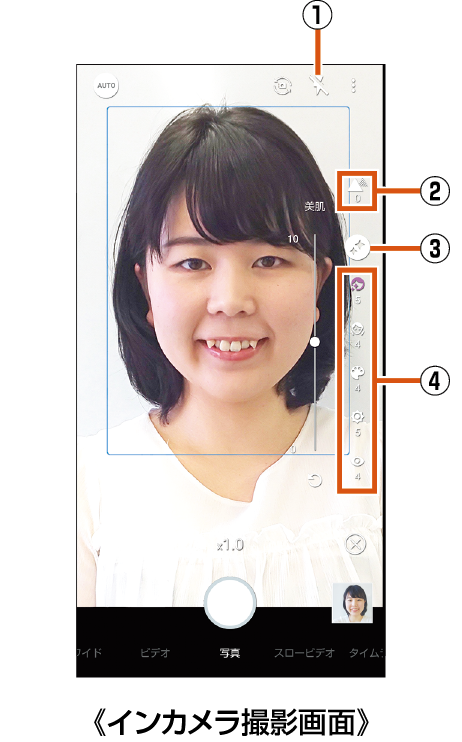 インカメラ利用時には、AQUOS beauty(アクオス ビューティー)機能で被写体の顔を補正することができます。