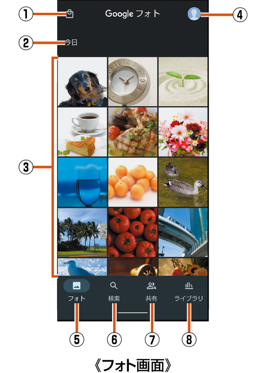 「フォト」アプリはPlay ストアより更新することができ、最新バージョンでは操作方法が変わることがあります。更新された場合は、フォト画面でアカウント設定のアイコンをタップ→[ヘルプとフィードバック]と操作し、内容をご確認ください。 |