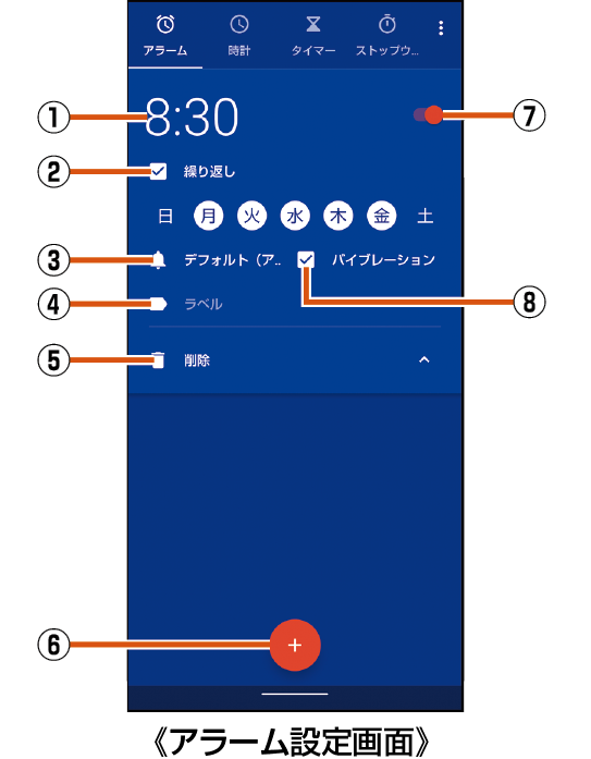 ホーム画面→「アプリ一覧画面」を表示→[時計]→[アラーム]