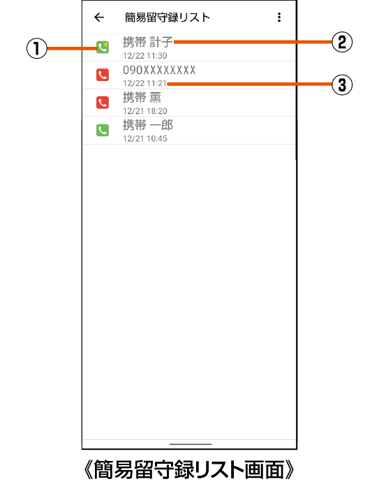簡易留守録リスト画面/通話音声メモリスト画面が表示されます。