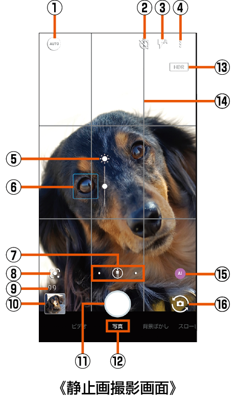 背景ぼかしとスロービデオは、標準カメラで撮影します。カメラの切り替えはできません。また、背景ぼかしは広角カメラを利用して距離を測定します。カメラレンズを手でおおわないでください。 |