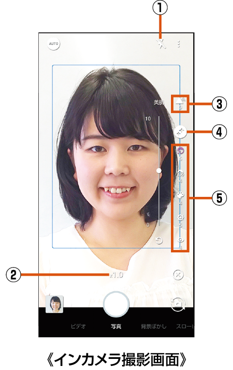 インカメラ利用時には、AQUOS beauty(アクオス ビューティー)機能で被写体の顔を補正することができます。